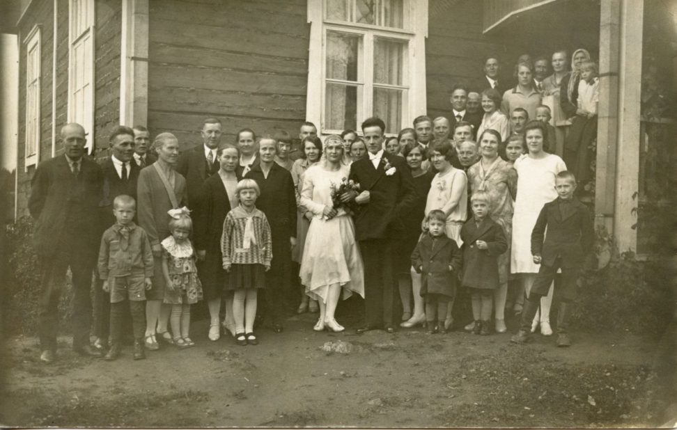 Eeva ja Jussi Mäkisen häät 13.10.1929. Niitä vietettiin Hiedanpään talossa Pässinmäessä. Kuvanumero 7185 Kuvausaika 13.10.1929 Kuvaaja T. Rantanen