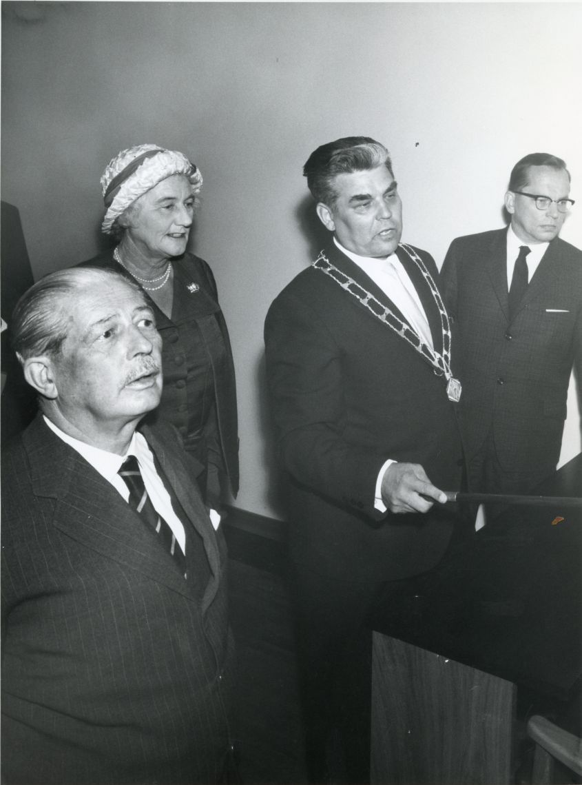 Kaupunginjohtaja Kaino Dahl ojentaa kaupungin avaimen pääministeri McMillanille ja Lady Dorothy McMillanille vuonna 1963. Kuvanumero: S33 Kuvausaika: 1963