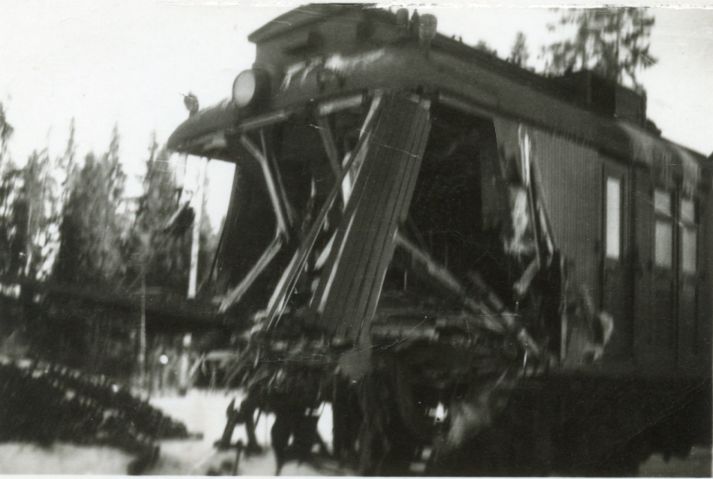 Junat törmäsivät yhteen 3.3.1943 rataosuudella Valkeakoski – Toijala. Kuvassa vahingoittunut matkustajavaunu. Kuvanumero 7128 Kuvausaika 3.3.1943