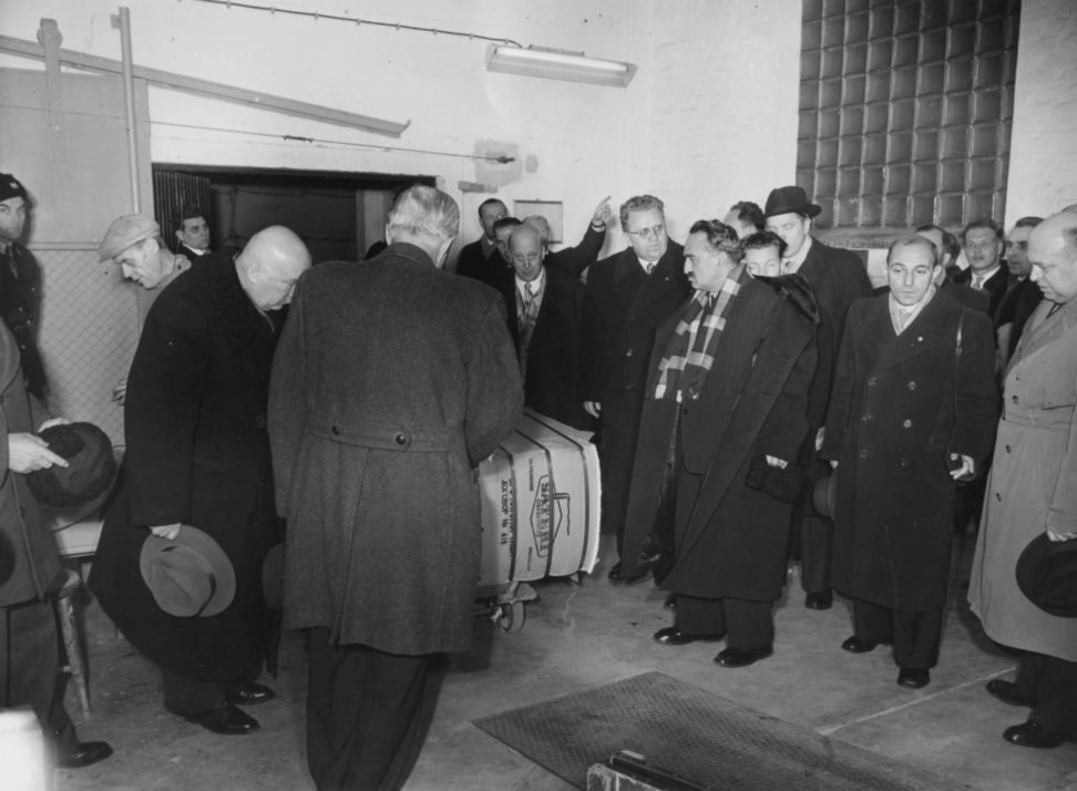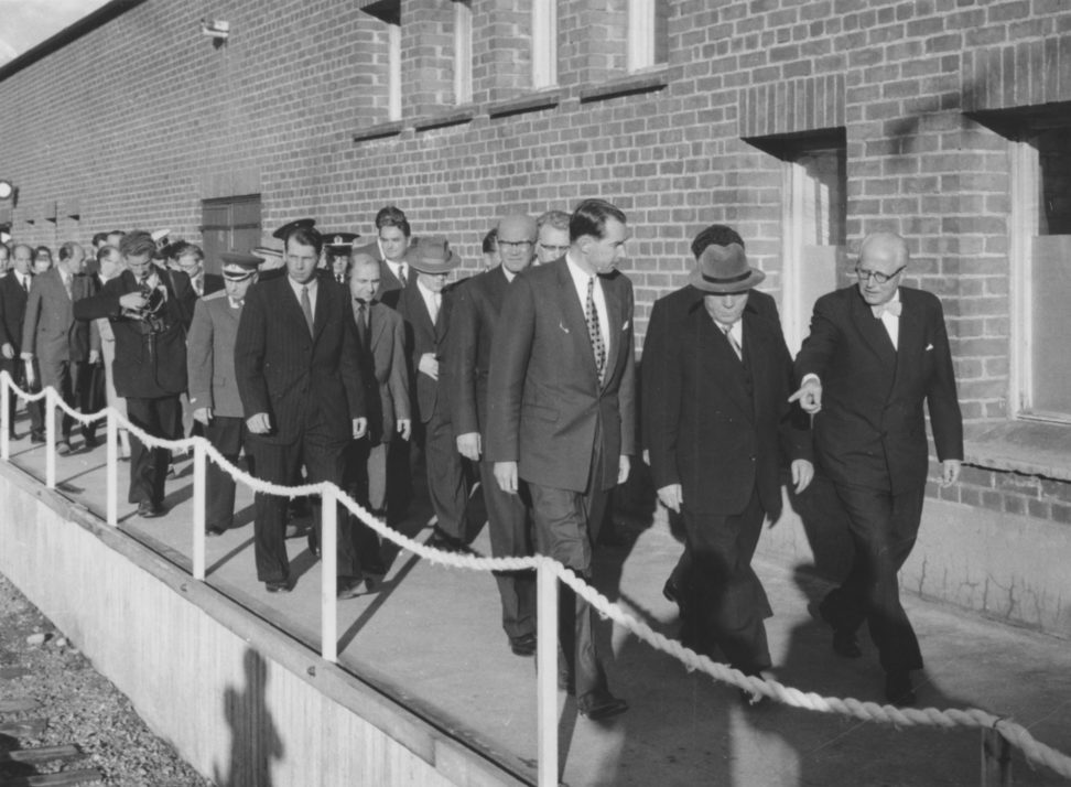 Illan pimetessä 7.8.1963 toimitusjohtaja K.A. Wrede oikealla ja yli-insinööri O. Glöersen hyvästelivät kuvan keskellä olevan Iso-Britannian pääministerin Harold McMillanin seurueineen. Valtiovallan edustajana oli mukana mm. toisena vasemmalla oleva ministeri Ahti Karjalainen. Kuvanumero: S34 Kuvausvuosi: 1963